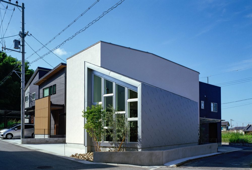 山辺の道の中程 天理市石上に建つこの邸宅は、斜めに張られた金属板の壁と屋根が印象的な建物である。
