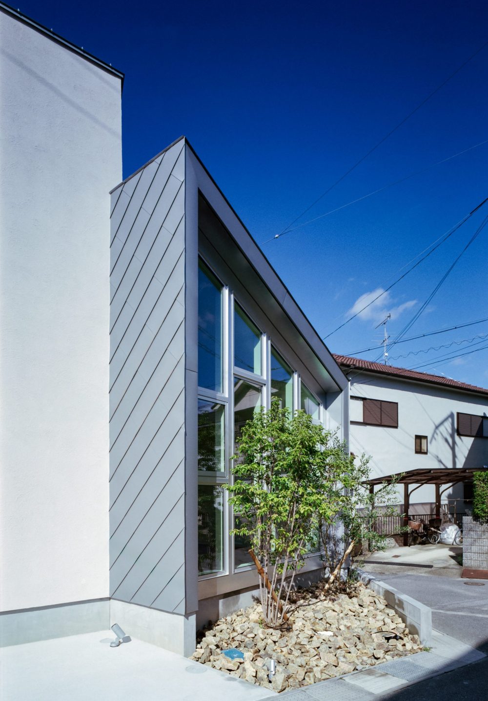 山辺の道の中程、天理市石上に建つこの邸宅は、斜めに張られた金属板の壁と屋根が印象的な建物である。
