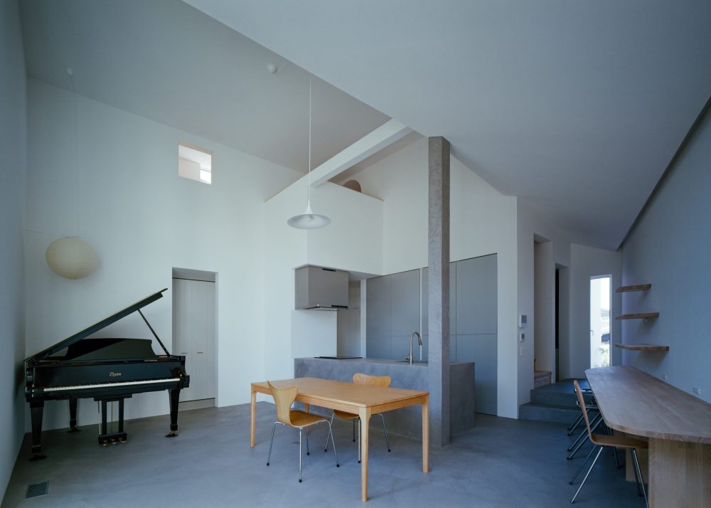 さらにその光は、斜めの壁が複雑に重なり合う吹抜け空間を柔らかに演出する。