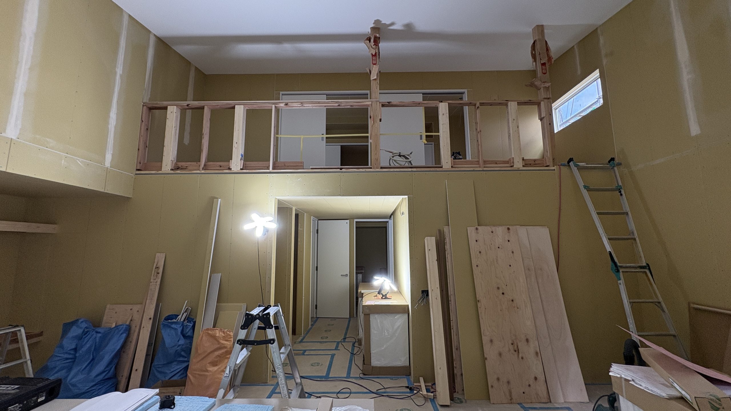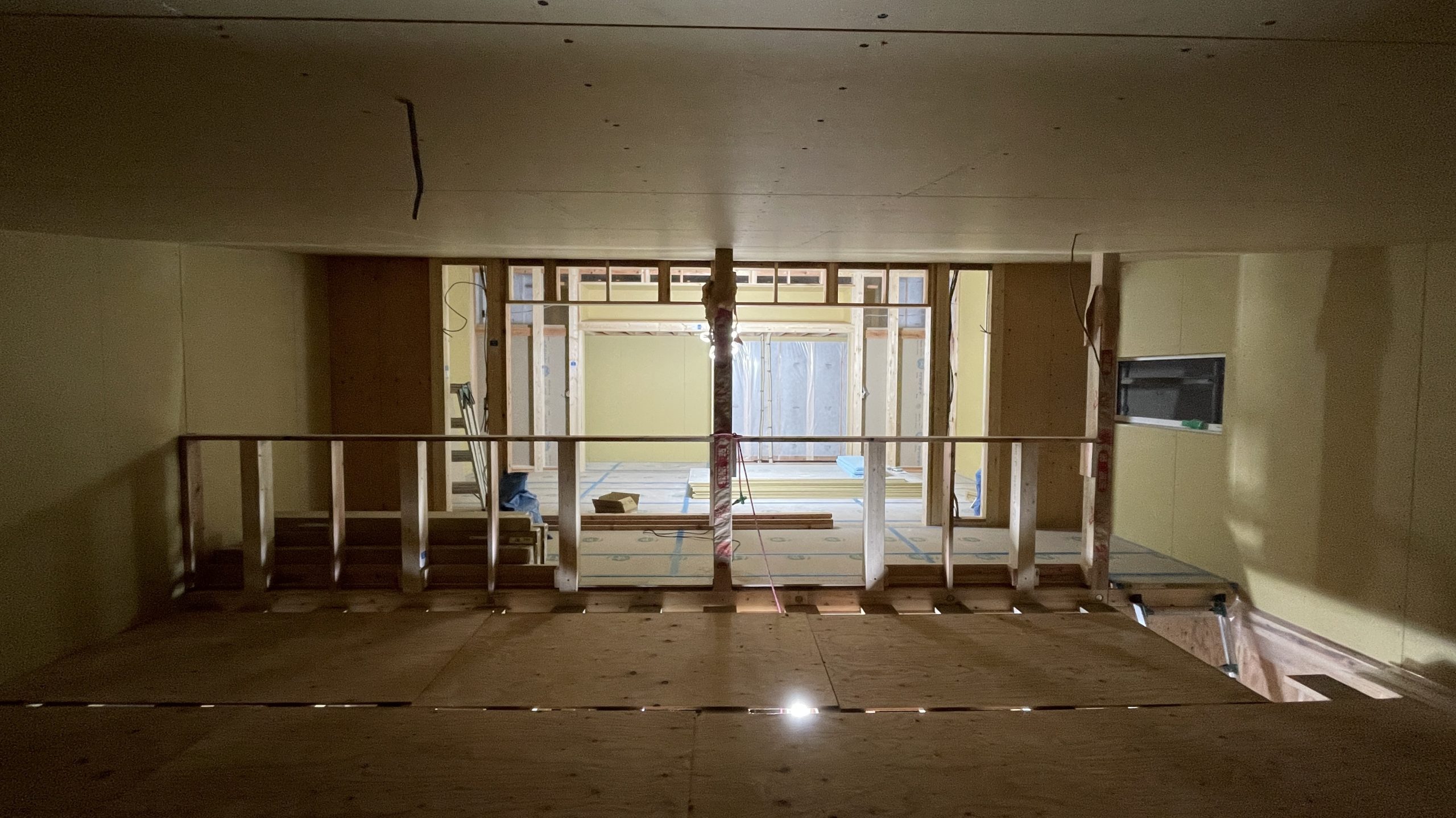 吹抜け部には、仮組みした足場を設け、作業をします。