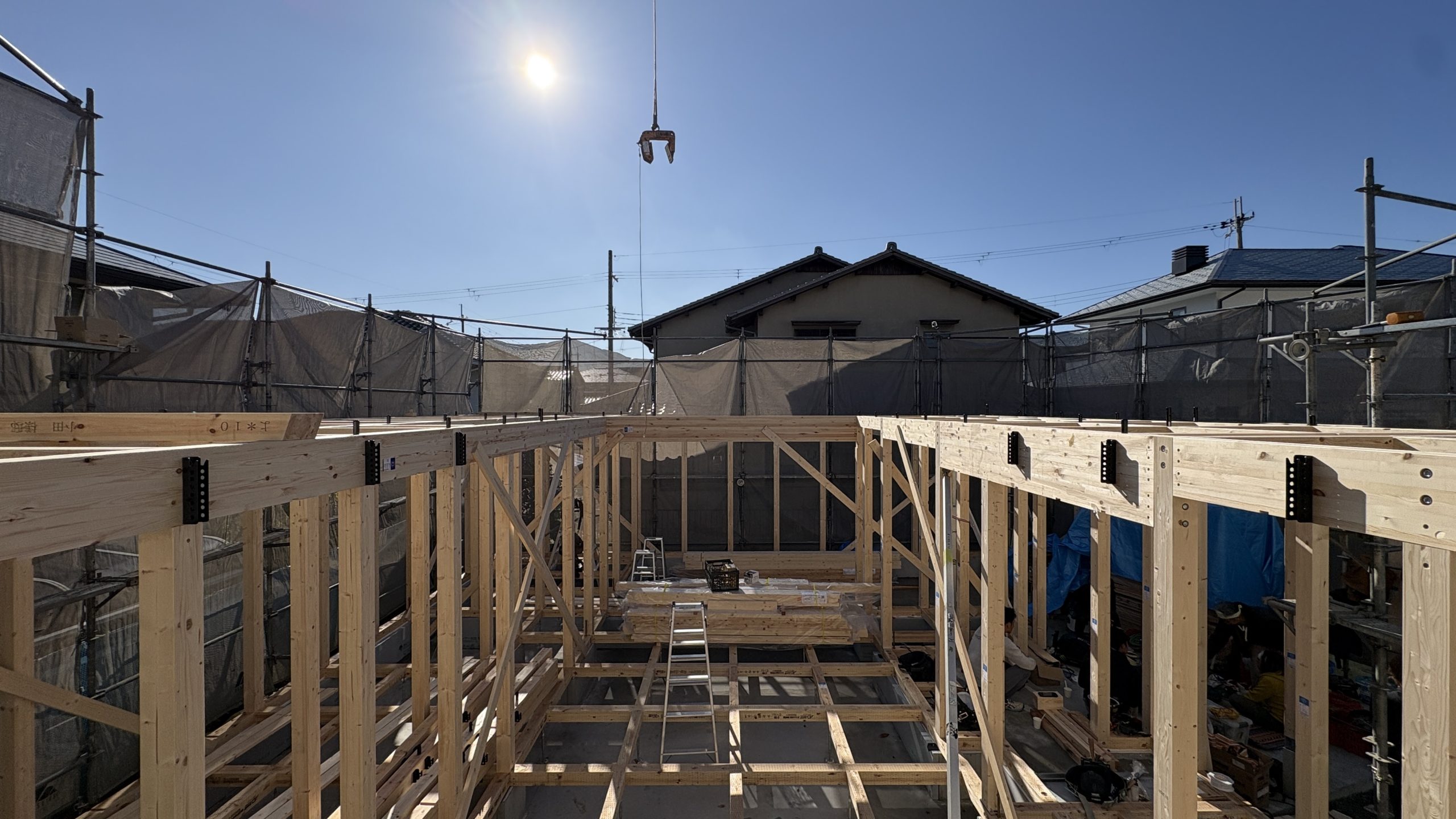 昨日・今日と、職人一同で棟上げを行ないました。圧巻です。
