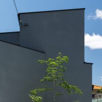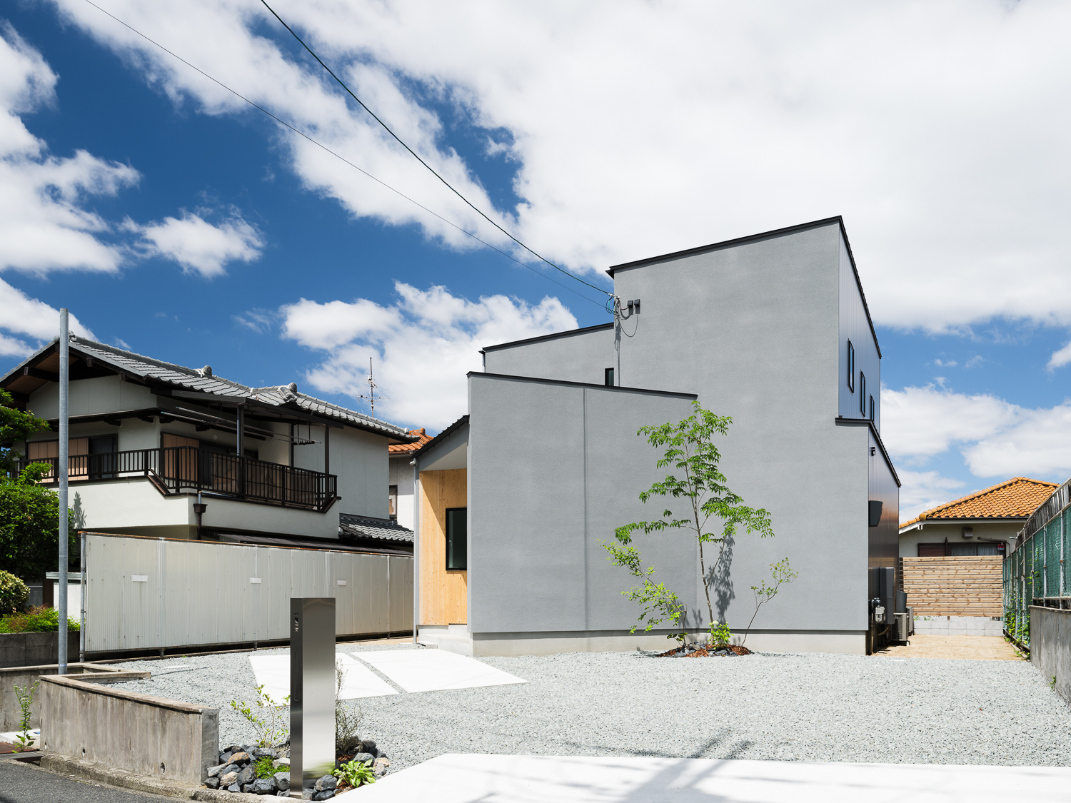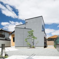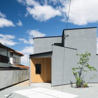 Set on a hilltop in Kashiwara City overlooking the Osaka Plain, this house presents two faces: the everyday and the extraordinary. Because we were able to secure a generous approach from the front road to the building, we conceived that approach as a device to articulate the home’s dual expressions. Using the angled wing wall at the entrance as an axis, the right-hand side reads as the extraordinary face, while the left-hand side is the everyday face.