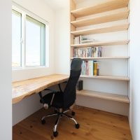 On the second floor, a long, horizontal desk faces the atrium, with children’s rooms of the minimum necessary size placed behind it. This configuration ties the children’s domain to the LDK below, drawing them into the family space and helping sustain a sense of togetherness.