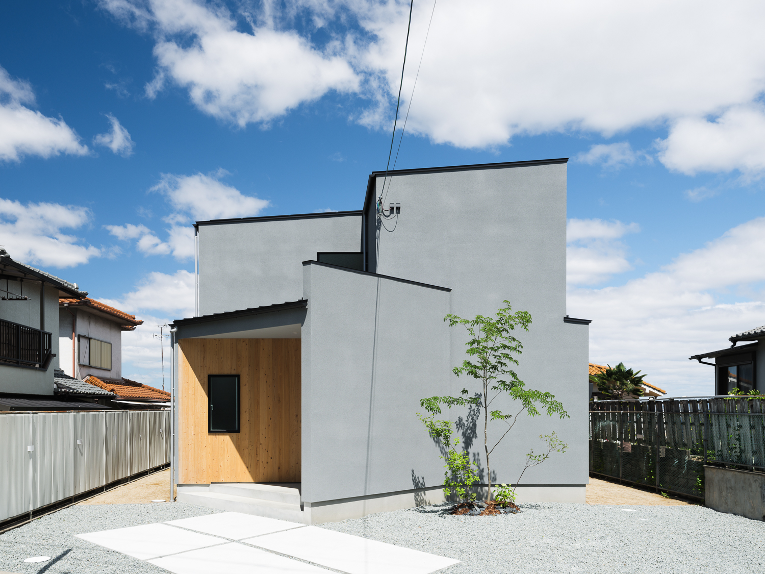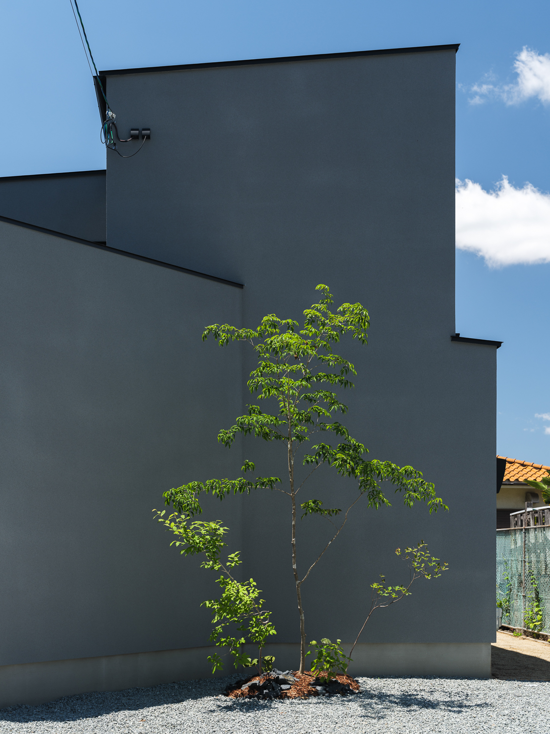 Set on a hilltop in Kashiwara City overlooking the Osaka Plain, this house presents two faces: the everyday and the extraordinary. Because we were able to secure a generous approach from the front road to the building, we conceived that approach as a device to articulate the home’s dual expressions. Using the angled wing wall at the entrance as an axis, the right-hand side reads as the extraordinary face, while the left-hand side is the everyday face.