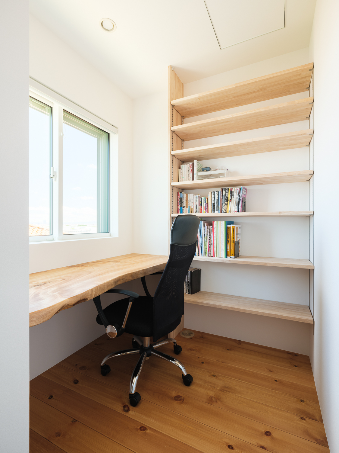 2階には、吹き抜けに向いて横長のデスクをつくり、その背面に必要最小限の子供部屋を設けることで、LDKとの住空間の一体化を図っている。